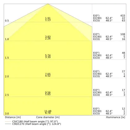 Le code couleur se compose de l'indice de rendu des couleurs (IRC) et de la température de couleur (Kelvin). Le premier chiffre indique le rendu des couleurs (1 = très mauvais rendu des couleurs, 9 = meilleure authenticité des couleurs). Le deuxième et troisième chiffre indiquent la température de la couleur. Exemple : Le code couleur "830" indique que la lampe a un bon rendu des couleurs (8) et une couleur de lumière blanche chaude (30 = 3000K). |
