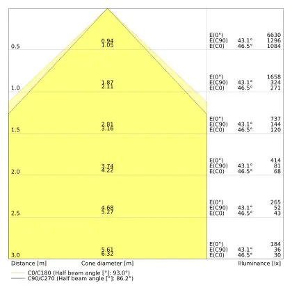 Le code couleur se compose de l'indice de rendu des couleurs (IRC) et de la température de couleur (Kelvin). Le premier chiffre indique le rendu des couleurs (1 = très mauvais rendu des couleurs, 9 = meilleure authenticité des couleurs). Le deuxième et troisième chiffre indiquent la température de la couleur. Exemple : Le code couleur "830" indique que la lampe a un bon rendu des couleurs (8) et une couleur de lumière blanche chaude (30 = 3000K). |