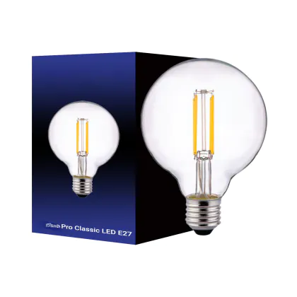 Cette ampoule Pro LED E27 Globe Filament Claire 95mm 8W 806lm - 827 | Dimmable - Remplacement 60W avec son efficacité lumineuse de lumen par watt vous permettra de profiter d’un éclairage de qualité. Avec sa durée de vie de 15000 heures, vous n’aurez pas à vous soucier de son remplacement avant quelques années.